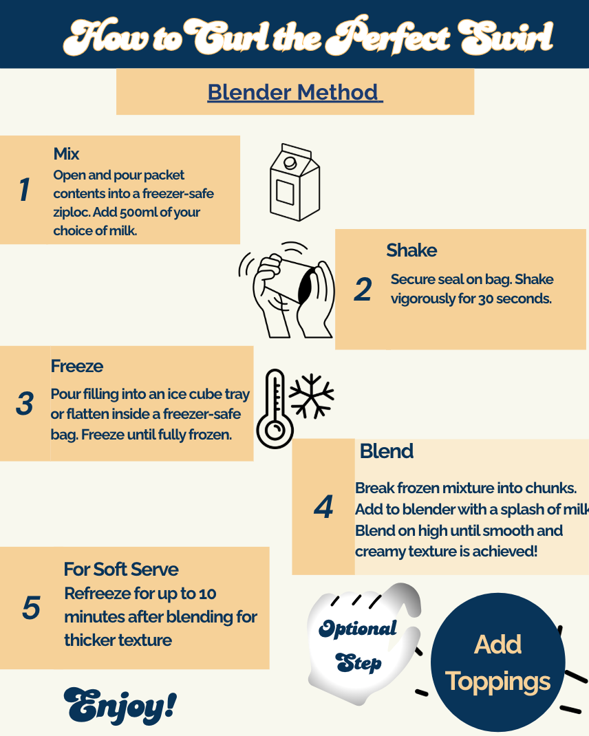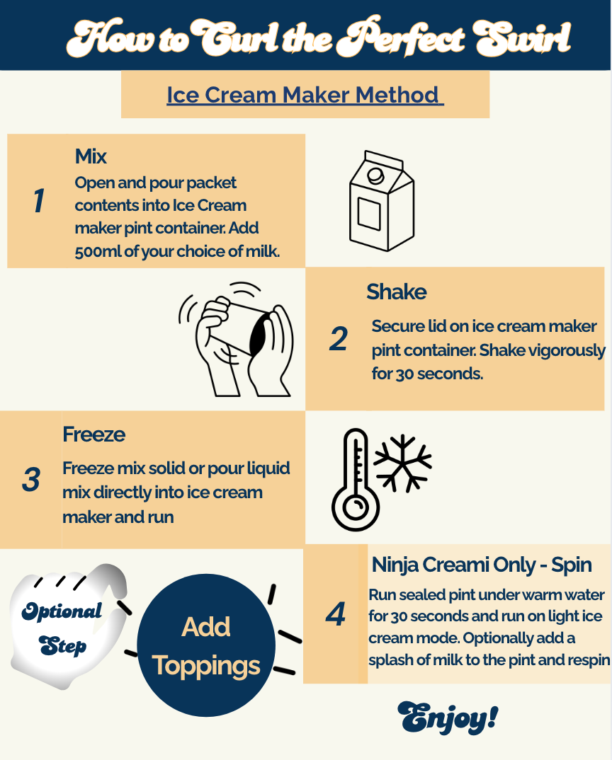 Tear open the package and pour into 500 mL of your choice of milk (e.g., 2% dairy, oat milk) in your Creami container.